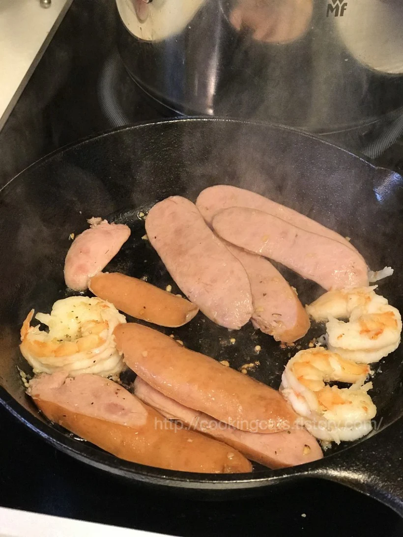 기름을 두르고 소시지를 먼저 구우면서 나온 기름으로 새우를 살짝 구워서 먼저 빼놓는다. 무쇠팬은 순식간에 열이 달아올라서 음식이 익어가므로 딴생각을 할수가 없다.